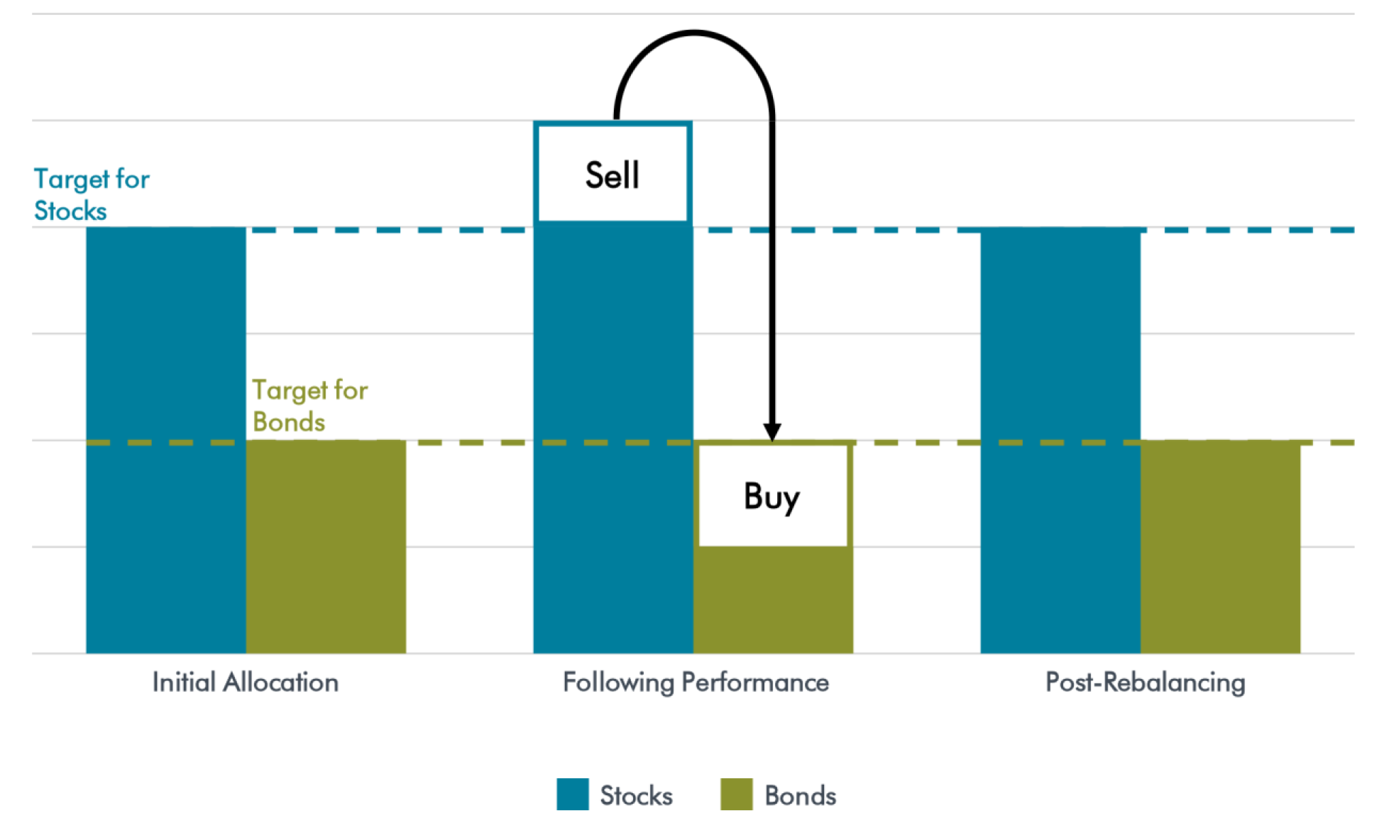 As we have seen in the first quarter of 2021 and in the first quarter of 2020, asset classes experience different performance. Since bonds have underperformed thus far this year, the original allocation in the portfolio may have drifted to overweight stocks and underweight bonds. To correct for these drifts in allocation, we employ rebalancing typically in terms of the following three factors: